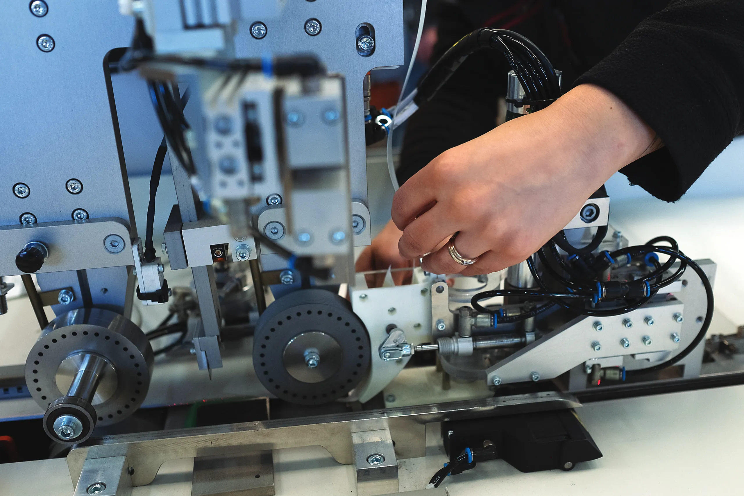 a. Le sezioni di tessuto vengono sovrapposte di una quota fissa utilizzando un’apposita guida e simultaneamente rifilate in modo speculare (sopra/sotto) con taglio ad ultrasuoni per garantire il perfetto accoppiamento del tessuto SENZA sormonto.